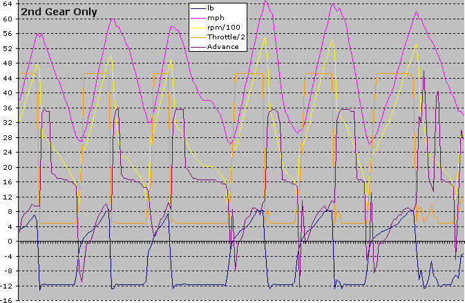I read the directions for the Palm software (auterraweb.com) and discovered that you can export the recorded data to a spreadsheet for analysis, so I did. The following plot (click on the image for a bigger view) plots the data recorded from this test drive. It is a portion of the data set, but representative of the cycles of throttle on/throttle off while remaining in 2nd gear on a moderate and reasonably constant hill climb.